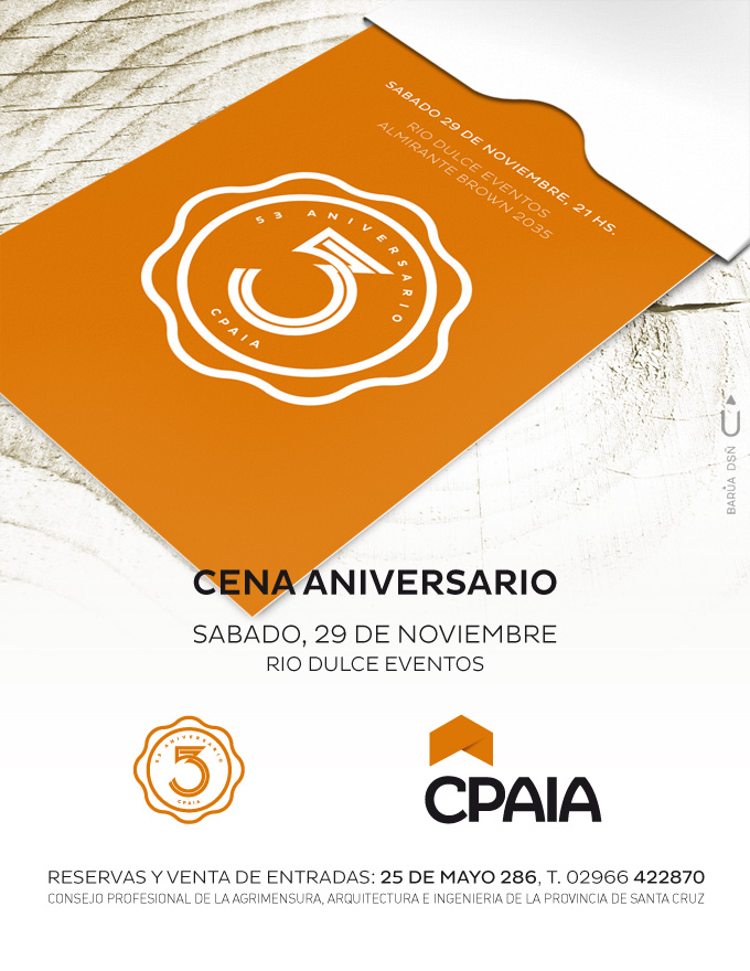 El sábado 29 de Noviembre de 2014, tendrá lugar la Cena 53º Aniversario del Consejo Profesional de la Agrimensura, Ingeniería y Arquitectura de Santa Cruz.