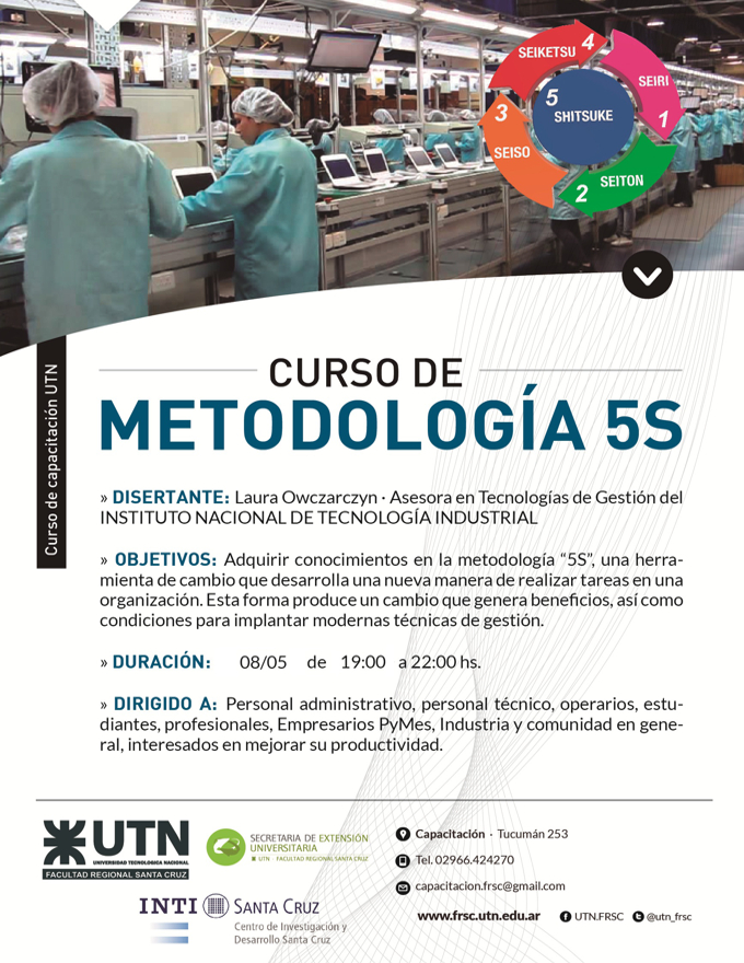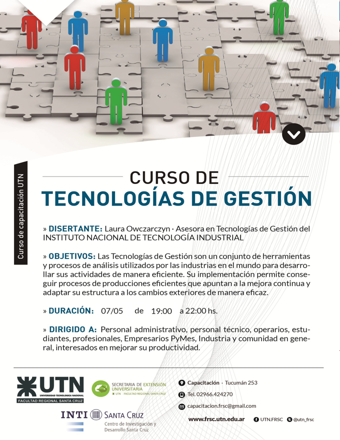 El mismo será dictado por la Lic Laura Owczarczyn, Asesora en Tecnología de Gestión en INTI - Entre Ríos. El horario será de 19:00 a 22:00 hs en las instalaciones de la UTN, los días jueves 7 y viernes 8 de Mayo.