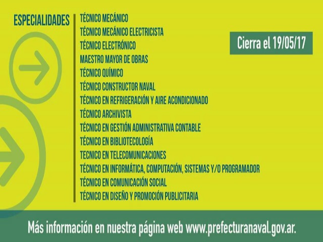 Prefectura Naval Argentina abrió la inscripción para ingreso como Cabo Segundo Cuerpo Auxilar para las siguientes especialidades.