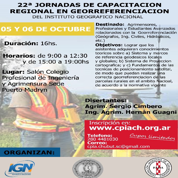 Organizan: Instituto Geografico Nacional - Colegio Profesional de Ingeniería y Agrimensura Chubut - Federación Argentina de Agrimensores.