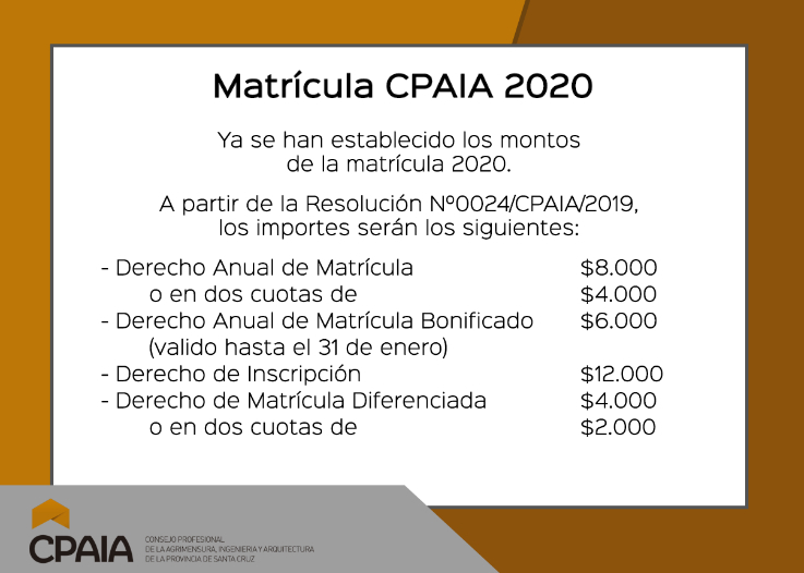 Atención Matriculados/as: Ya se han establecido los montos para abonar la matricula 2020, a partir de la Resolución Nº0024/CPAIA/2019.